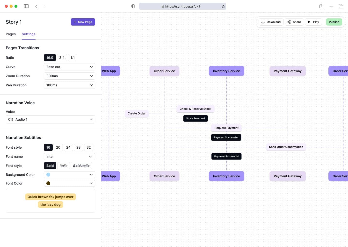 Users can attach explanatory text, narration, and highlights, transforming static diagrams into interactive walkthroughs for onboarding, stakeholder communication, or training.