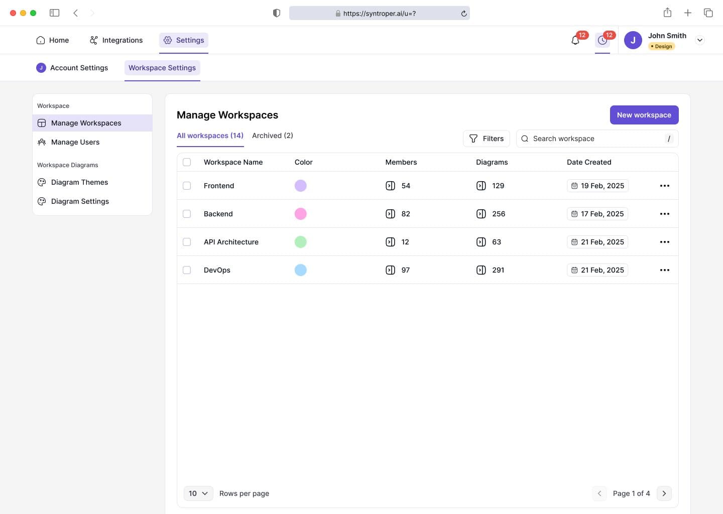Admins can add or remove members, update workspace details, manage integrations, and monitor activity logs. Teams can restructure folders, archive old diagrams, and maintain consistency across architectural assets.
