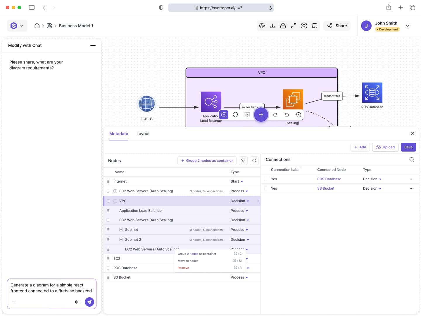 Metadata Management allows users to attach structured information to diagrams and individual components. This ensures diagrams carry meaningful context beyond visuals, improving traceability and long-term usability.